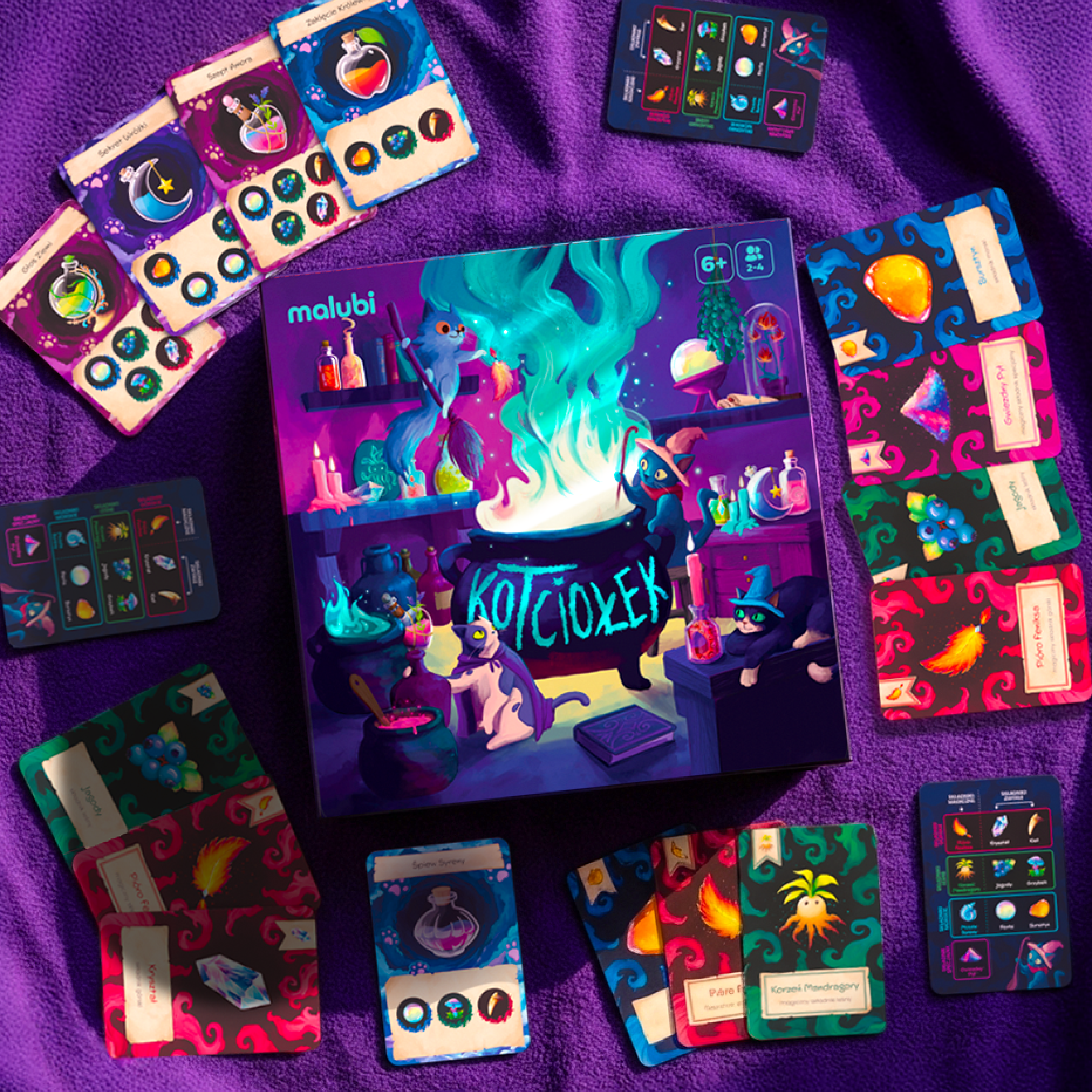 Kotciołek to dynamiczna gra karciana, w której gracze wcielają się w koty-alchemików tworzące magiczne mikstury pod nieobecność czarodzieja. Podczas rozgrywki zbierają i wymieniają się składnikami, planują swoje działania i próbują przechytrzyć rywali.