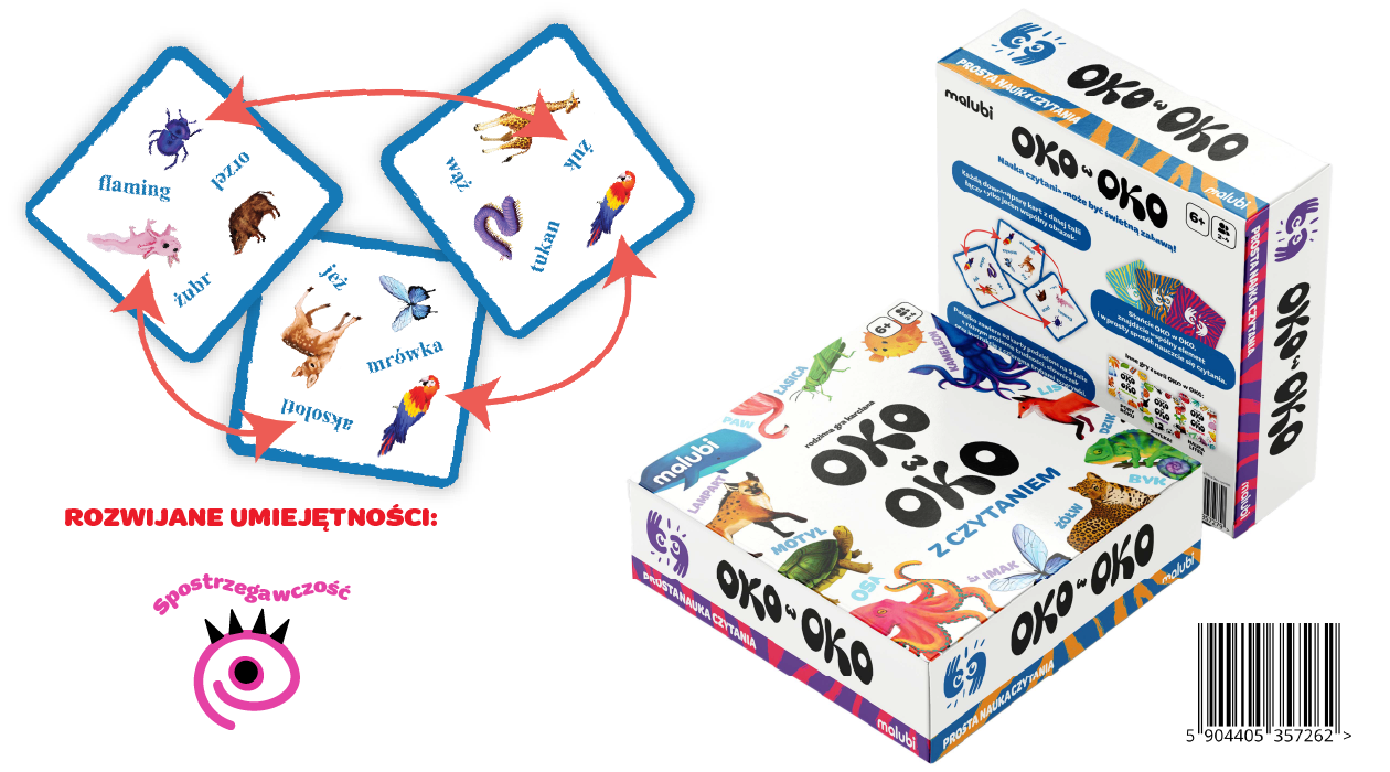 „Oko w Oko z Czytaniem” to gra, która sprawia, że nauka czytania staje się ekscytującą zabawą! W tej grze dzieci łączą obrazki z odpowiednimi wyrazami, co rozwija umiejętność rozpoznawania liter i słów w naturalny sposób. Zadaniem graczy jest dopasowanie obrazka do słowa, co angażuje nie tylko wzrok, ale również koncentrację i zdolność czytania. Gra aktywuje umiejętności analizy wzrokowej, pomaga w rozwoju słownictwa i pozwala przyswajać nowe słowa w dynamiczny sposób. W zestawie znajdziesz 83 karty, podzielone na trzy talie o zróżnicowanym poziomie trudności oraz 4 tryby rozgrywki, które dostosowują grę do wieku i umiejętności dzieci. Dodatkowo w pudełku znajduje się słowniczek, który wspiera naukę nowych słów. To świetne narzędzie do nauki czytania, które angażuje dzieci, wspomaga ich rozwój językowy i pomaga w zdobywaniu nowych umiejętności, a wszystko to przez… zabawę!