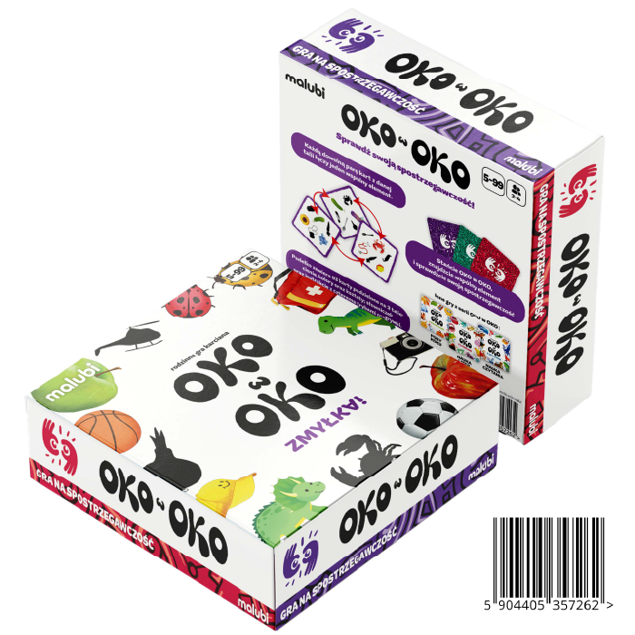 „Oko w Oko Zmyłka” to gra, która wciąga od pierwszej karty i nie odpuszcza do samego końca! Wystarczy rozłożyć talię, wytężyć wzrok i ruszyć do akcji – każda sekunda ma znaczenie, a każdy szczegół może być na wagę… zwycięstwa! Brzmi prosto? Tylko na pierwszy rzut oka! Karty wyglądają podobnie, ale łączy je tylko jeden, sprytnie ukryty element – kolor, kształt, a może cień…? Dopasować ten sam przedmiot? Jasne, ale co jeśli różni się cieniem albo kolorem?! Znaleźć go szybciej niż inni – to jedyny sposób, by zdobyć punkt i nie dać się zmylić! To prawdziwy hit – dzieci mają tu przewagę, a dorośli…? Cóż, muszą się naprawdę postarać! W rodzinnym starciu okazuje się, że młodsi gracze potrafią przechytrzyć starszych w mgnieniu oka. Każda partia to nowe wyzwanie i okazja, by sprawdzić, kto ma naprawdę bystre oko. W pudełku aż 93 karty pełne wizualnych zagadek i 4 tryby gry, które zmieniają każde spotkanie w coś zupełnie innego. Bawić się spokojnie czy iść na żywioł? Wybór należy do Was – jedno jest pewne: zmyłka czai się wszędzie!